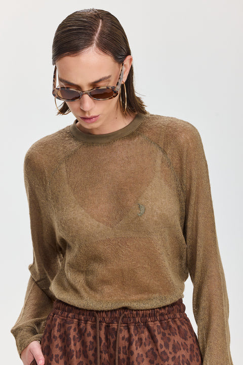 חולצה בגזרה ישרה אוברסייזית ושרוולים שמלווים את הגוף וסופר מחמיאים, בסריגה דקה ואוורירית, השרוולים בחיתוך מחמיא בכתפיים, ועם רקמת צ'ילי סטייטמנט