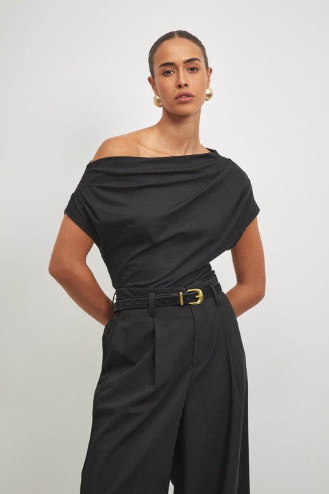 חולצה אוף שולדר לואיס אסימטרית כיווצים כתף אחת שחורה