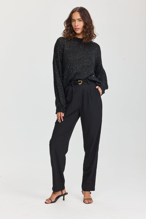 מכנסיים מחוייטים בגזרה ישרה וצרים למטה, עם קפלים עדינים וגומי אחורי רך במתניים. יושב על הגוף בצורה מדוייקת ומחמיאים