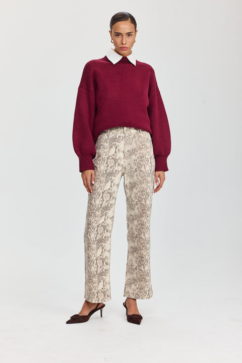 מכנסי ג'ינס בגזרה גבוהה, צללית ישרה, מבד עם מתיחה לנוחות מירבית והדפס נחש אייקוני ומשדרג כל לוק.