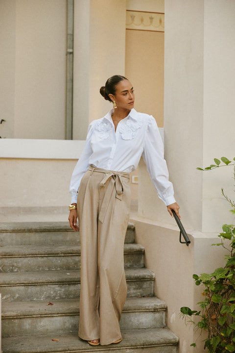 מכנסיים מחוייטים בגזרה ישרה, עם קפלים עדינים, גומי אחורי רך במתניים, וחגורה תואמת לדיטייל מתוחכם ואלגנטי.