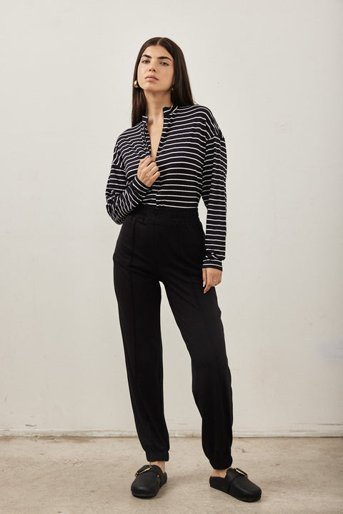 מכנסים מחויטים בגזרת ג'וגר עם גומי ועם פסי נירבינים המדגישים את קווי המתאר ומאריכים .את הגוף, סופר מחמיאים