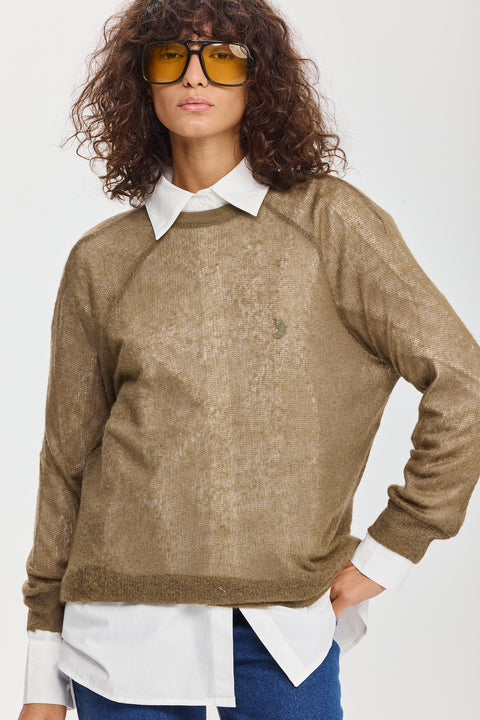 חולצה בגזרה ישרה אוברסייזית ושרוולים שמלווים את הגוף וסופר מחמיאים, בסריגה דקה ואוורירית, השרוולים בחיתוך מחמיא בכתפיים, ועם רקמת צ'ילי סטייטמנט