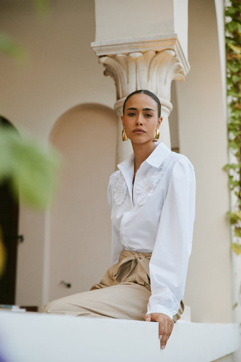 חולצה מכופתרת בגזרה ישרה עם שרוולים תפוחים, בדיטייל פרחים חגיגי ומתוחכם, מבד כותנה רך ועשיר.