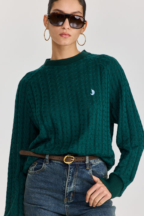 סריג בגזרה ישרה אוברסייזית ושרוולים שמלווים את הגוף וסופר מחמיאים, השרוולים בחיתוך מחמיא בכתפיים, מבד סריג בטקסטורת צמות עדינה ורקמת צ'ילי אייקונית