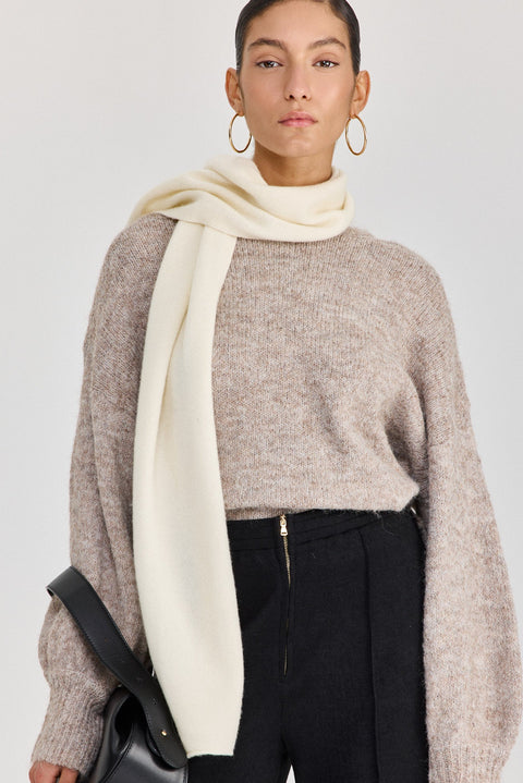 צעיף סריג חלק בגוון שמנת, בעל מרקם רך ונעים למגע. עיצוב נקי וקלאסי עם לוגו מתכתי אלגנטי בקצה. מעניק חימום מצוין ומראה על זמני שמתאים לכל לוק חורפי.