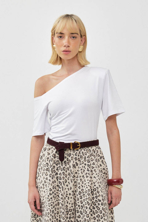 חולצה בגזרה אסימטרית אוף שולדר עם כרית בכתף השניה בגזרת פיט
