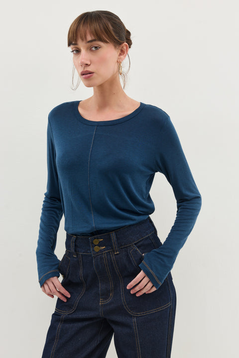 חולצה בגזרה משוחררת מבד דקיק רך ונעים, עם תפר דקורטיבי במרכז. פריט יומיומי נקי ומדויק