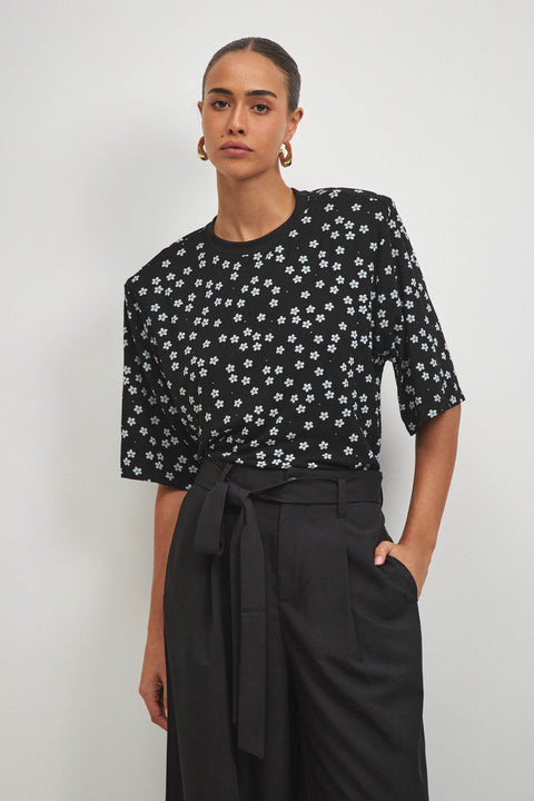 חולצת מניפיק פרחים כריות כתפיים נשלפות שחורה