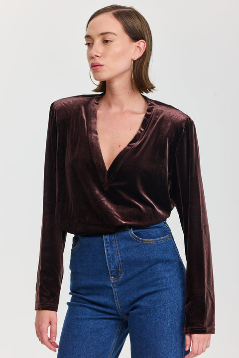 חולצת פנקייק קטיפה כריות נשלפות מפתח וי ארוכה חום שוקולד