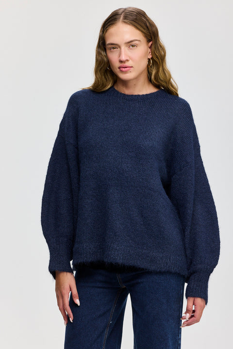 סוודר פרזנט מקולקציית Birthday האייקונית בגזרת אוברסייז, בטכניקת סריגה ייחודית שפיתחנו, עם צווארון עגול ושרוולים תפוחים עשירים.
