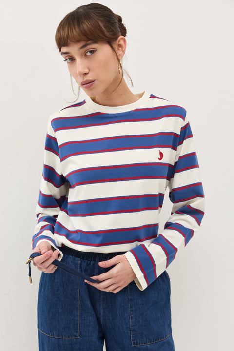 . חולצה בגזרה נינוחה מבד רך ונעים, בעיצוב פסים רחבים בגווני כחול ושמנת עם נגיעות אדום עם כריות כתפיים נשלפות.