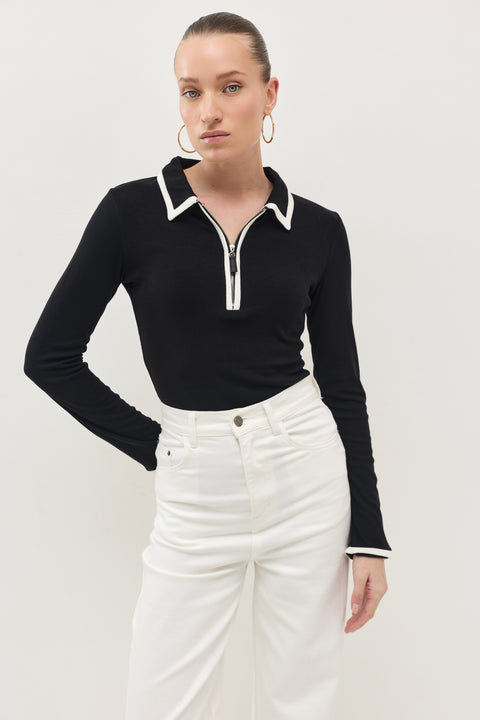 בגזרה מחמיאה עם צווארון ורוכסן קדמי, בשילוב פסי קונטרסט לבנים. לוק נקי, אלגנטי ומדויק . מושלמת לשילוב עם ג׳ינס או מכנס מחויט