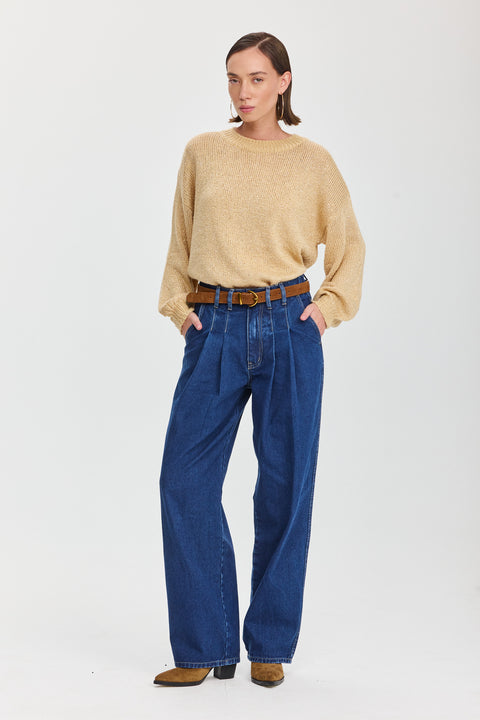 מכנסי ג'ינס בגזרה ישרה, עם אלמנטים מחוייטים שנותנים לו מצד אחד אלגנטיות, והגזרה מצד שני נונשלאנטית וכיפית. עם גומי רך אחורי במתניים.
